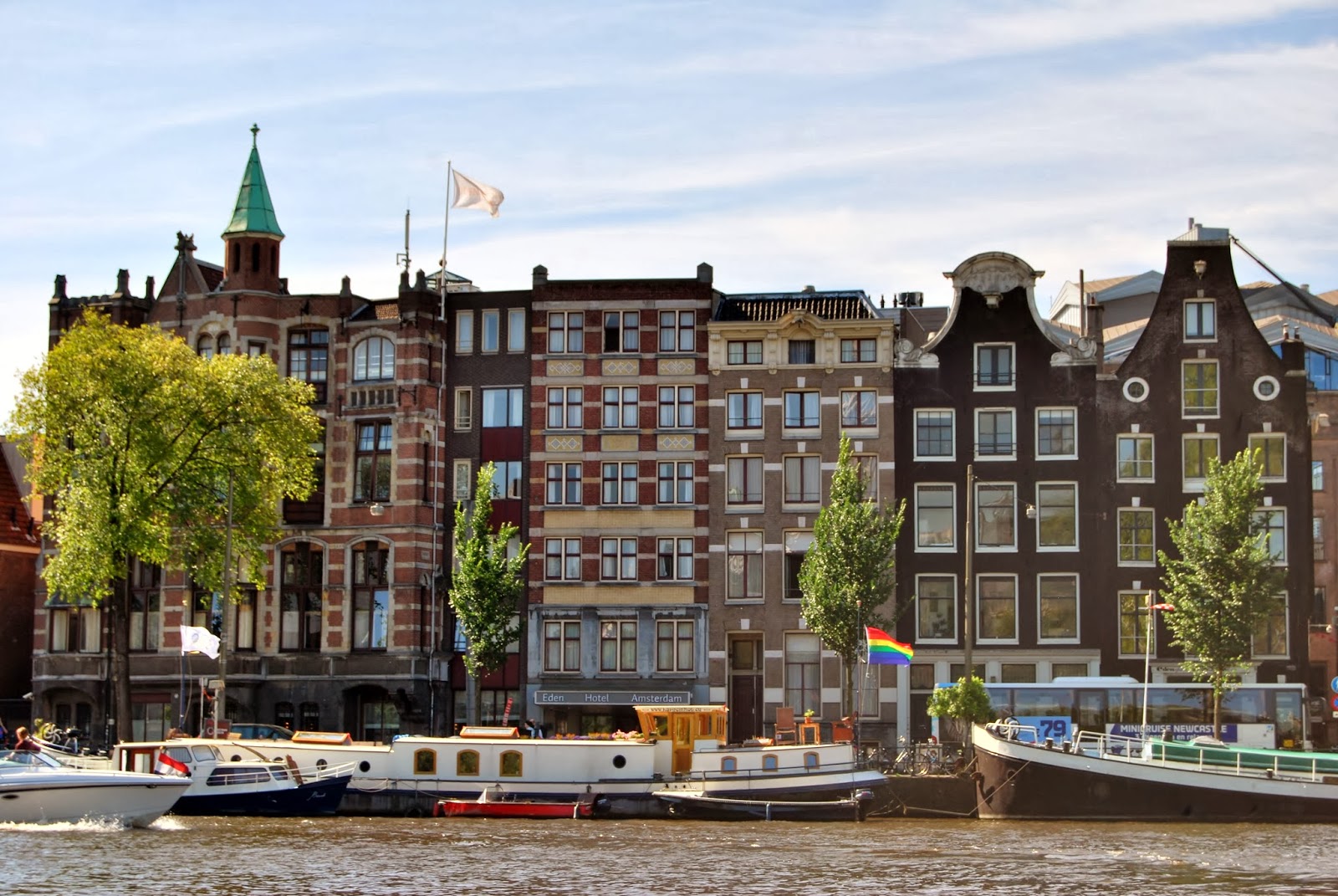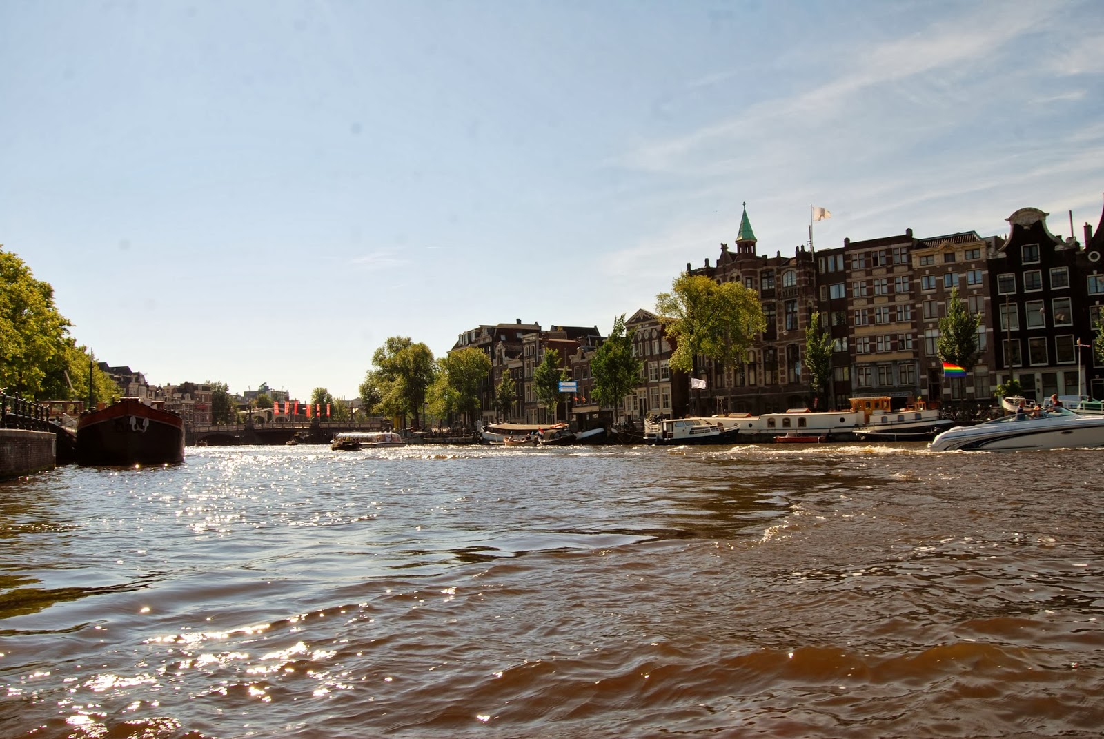 L’autobus repart et nous emmène faire un premier tour d’Amsterdam. Il traverse les multiples canaux et les quartiers avec des maisons accolées les unes aux autres et toutes munies d’un crochet au sommet afin d’y installer les meubles ou les déménager avec facilité. C’est d’ailleurs le moment d’aller faire une ballade sur les canaux. Je prends place dans un long bateau à fond plat et très bas et c’est parti !!!